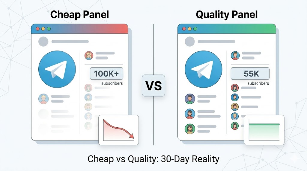 Step 3. Run identical small test orders on each. Same service category (say, 500 Telegram subscribers from each panel), same delivery setting, same target channel.